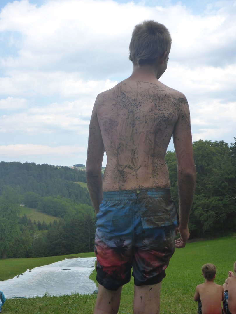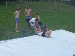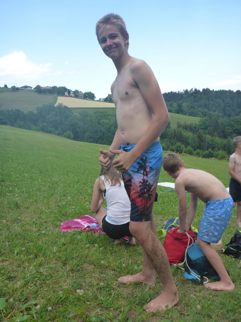 Um 14 Uhr ging es bei strahlendem Sonnenschein los. Schauplatz des Spektakels war die Wiese bei der Familie Barth in Kammerschlag. Mutig stürzten sich die Kinder immer und immer wieder den steilen Hang hinunter und hatten sichtlich viel Spaß dabei. Als dann nach etwa zwei Stunden die Kräfte allmählich zu Neige gingen und wir beginnen wollten ein Lagerfeuer zu machen um Knacker zu grillen, begann es in Kammerschlag leider wie aus Eimern zu regnen. Dankenswerter Weise stellte uns Familie Barth ihren Gasgriller sowie eine große Zucchini und Eier zur Verfügung und wir konnten die hungrigen Kinder in der Garage mit gebratenen Knackern, Zucchini, Spiegeleiern und frischem Gebäck versorgen und mit Spielen unterhalten, bis sie schließlich um 19 Uhr wieder abgeholt wurden.