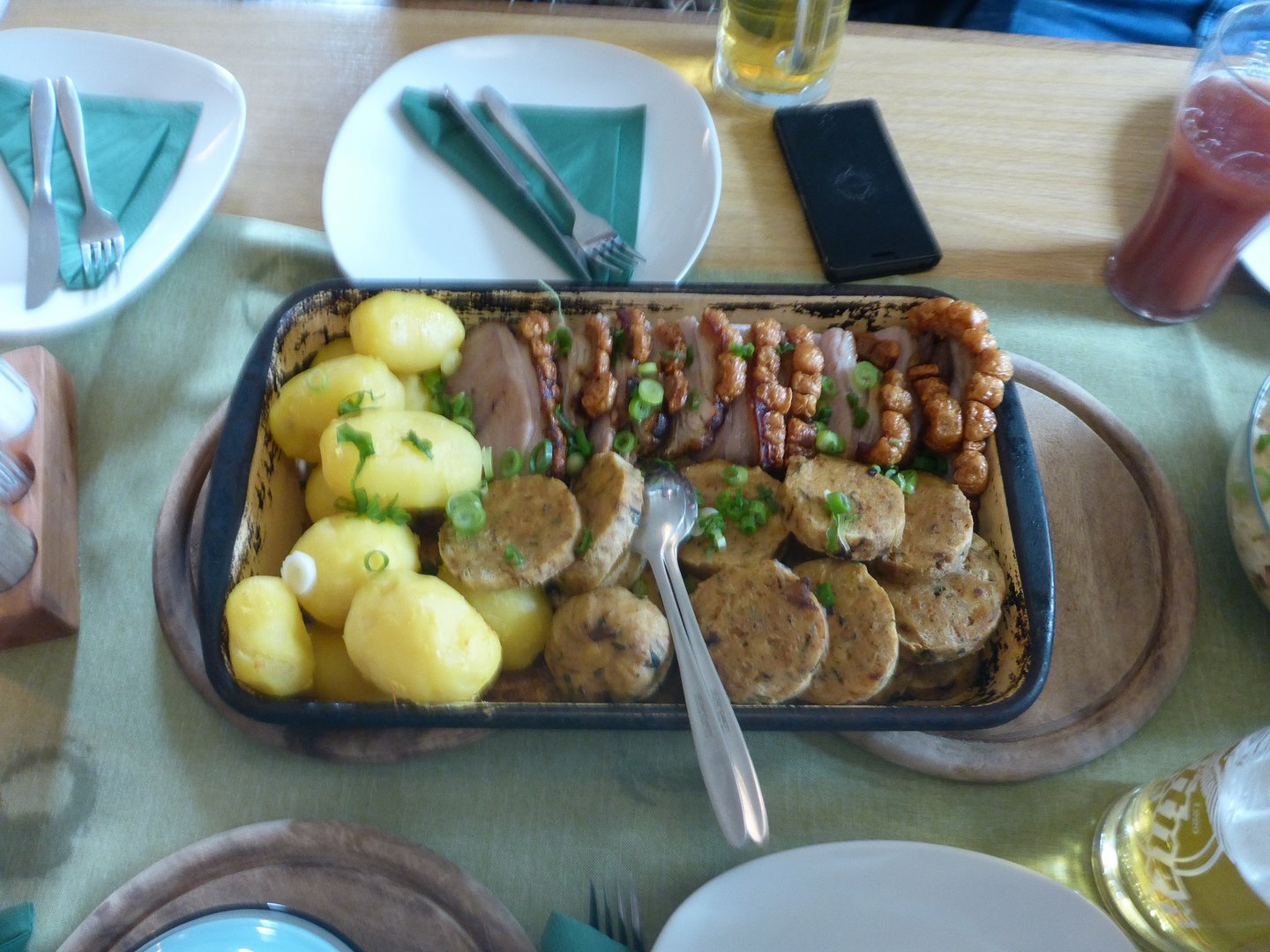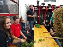 Somit marschierten wir auch heuer mit einer wunderschön geschmückten Erntekrone, die wir zwei Tage zuvor "aufgeputzt" hatten und Körben voll Obst, Gemüse und Brot beim Festzug in die Kirche mit. Nach dem Gottesdienst kam um 12 Uhr der bestellte Bus nach Eidenberg und 19 Hungrige machten sich auf den Weg zur Jausenstation am Hansberg. Nach einer schier unendlich langen Fahrt verspeisten wird dort ein ausgezeichnetes "Bratl in der Rein". Nachdem alle Bäuche bis nach oben hin gefüllt waren, ging es wieder zurück nach Eidenberg.