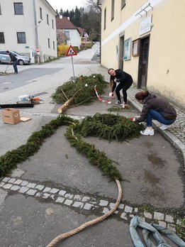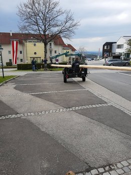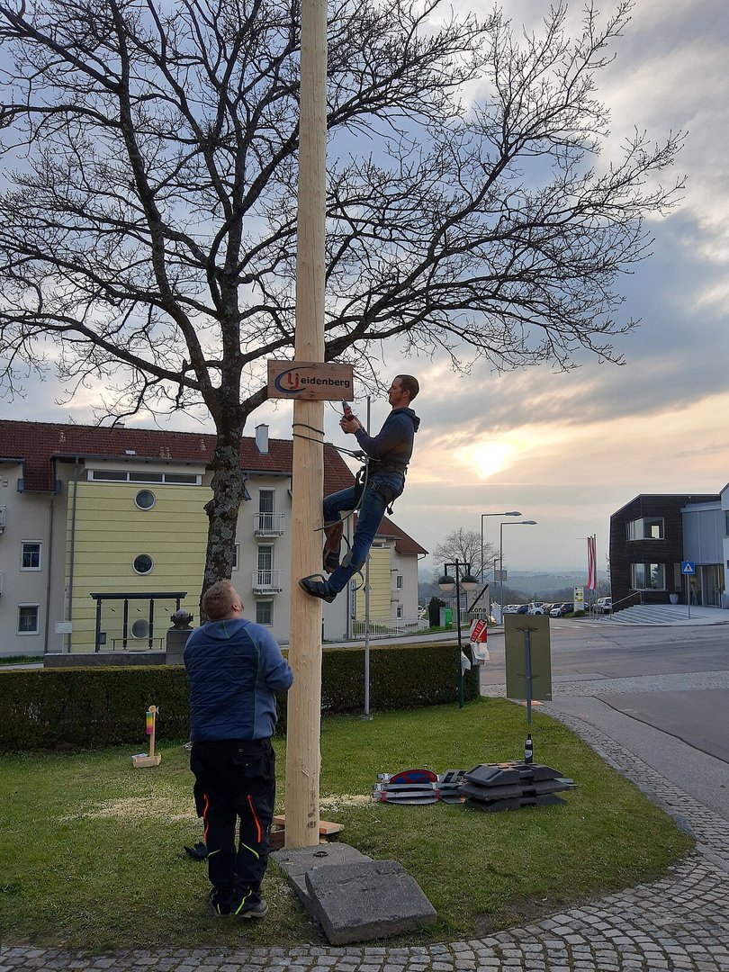 Um 17 Uhr transportierten wir daher den vom Stift Willhering gesponserten Baum auf den Ortsplatz um ihn noch fertig vorzubereiten. Da wir aufgrund von Corona kein Maibaumfest veranstalten durften wurde der Maibaum unter bestmöglicher Einhaltung der Corona Regelungen mit technischer Hilfe aufgestellt. Der dazu nötige, am Baum festgemachte, Gurt wurde anschließend noch von unseren mutigen Kletterern entfernt. Anschließend wurde im Freien noch mit Abstand gepasst um Diebe fernzuhalten bis es uns schließlich zu kalt wurde,