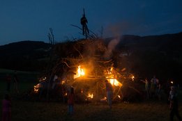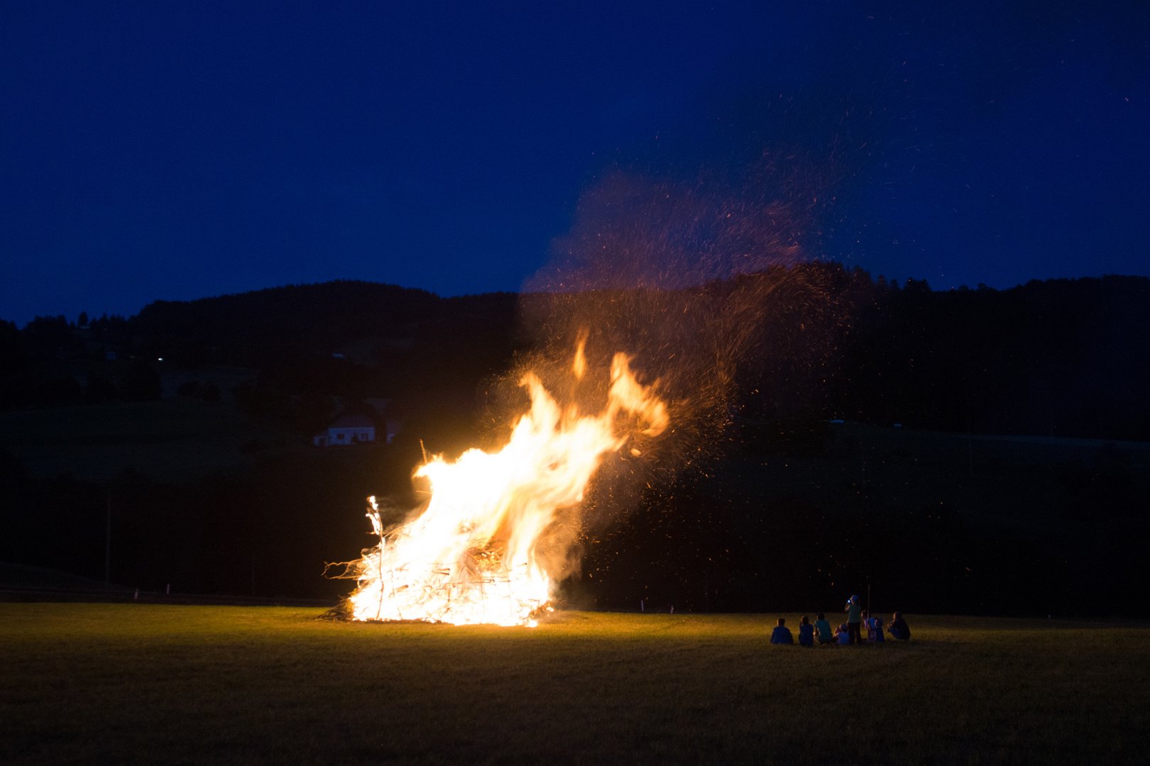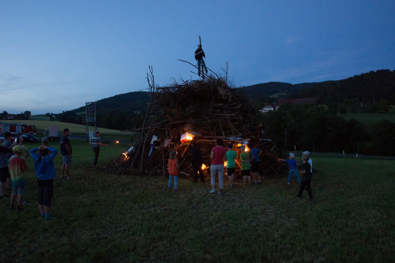 Diesmal war der Austragungsort die Familie Baumgartner vulgo Elmer in der Edt. Zum Glück legte sich am Abend der tagsüber fast schon stürmische Wind und das Sonnwendfeuer konnte gegen 21:30h ohne Bedenken entzündet werden.