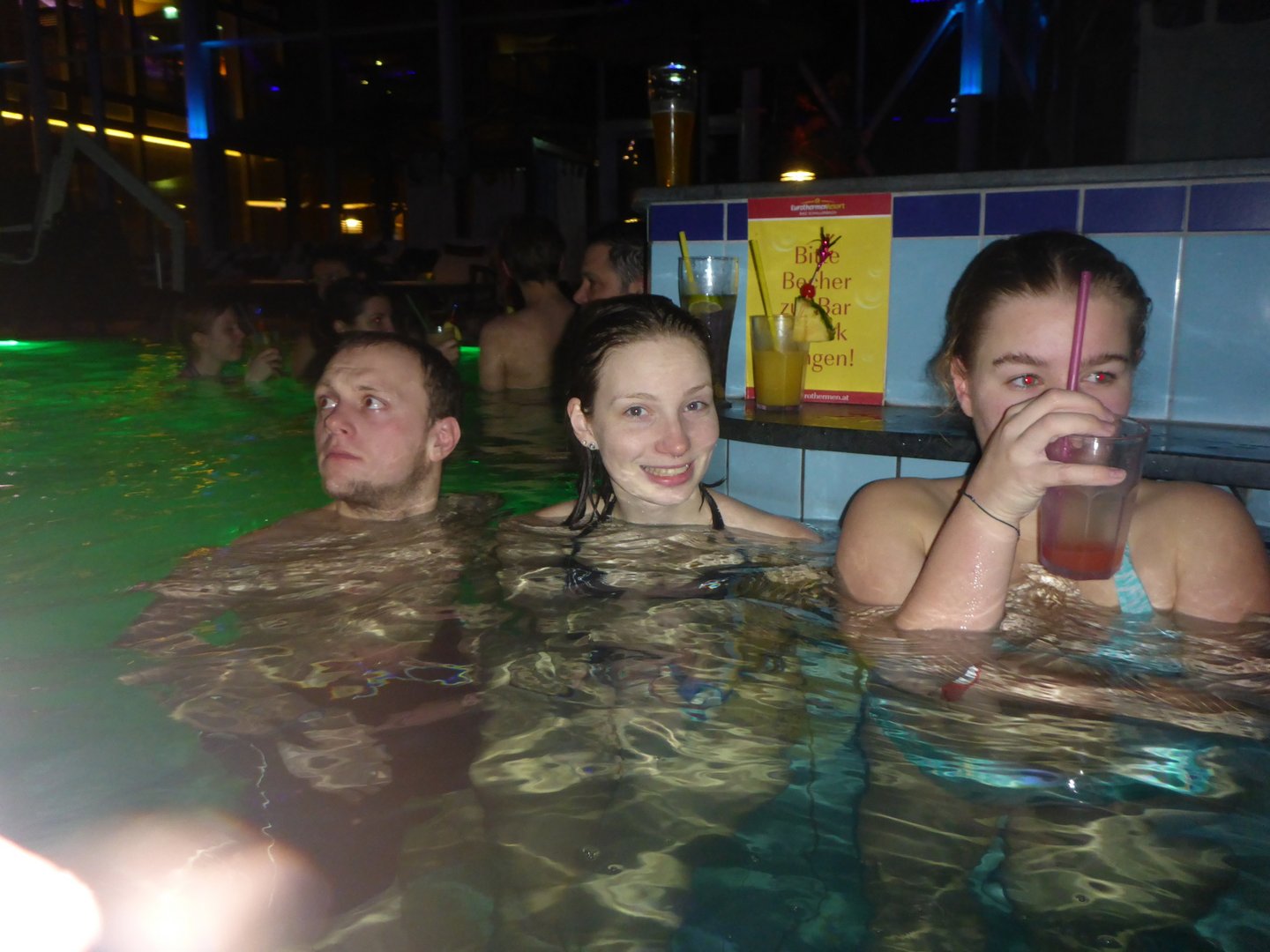 Am 26. Jänner um 18 Uhr ging es los. 21 schwimmbegeisterte Mitglieder versammelten sich dazu am Ortsplatz in Eidenberg. Nachdem die Fahrgemeinschaften gebildet waren, machten wir uns auf den Weg. Bis zum Zusperren verbrachten wir viele lustige Stunden an den Rutschen und in den vielen Schwimmbecken. Natürlich wurde auch die Bar nicht ausgelassen. :)